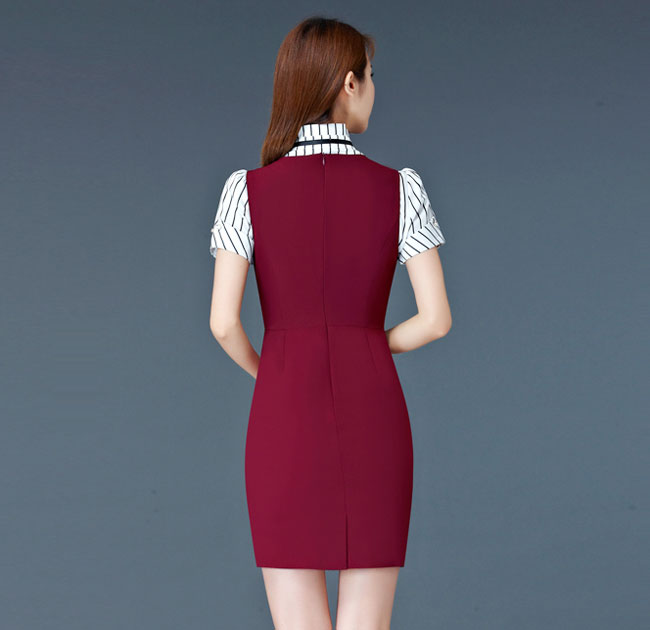 商場專柜營業(yè)員工作服多色款式選擇參考展示圖 棗紅色商場專柜營業(yè)員工作服款式模特展示圖